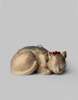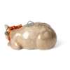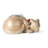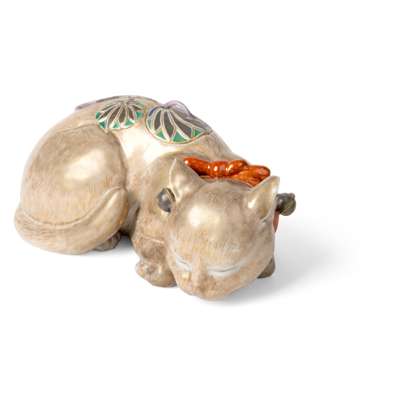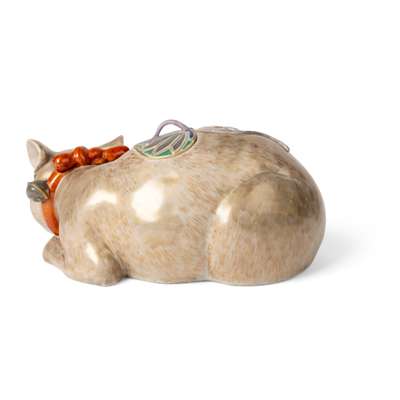 realistically moulded as a cat with all fours tucked in, curled to one side, tail curved in, finely painted in gild with manes, tied with a red ribbon hung with two bells, leaves covered the back and one with a vine handle lifts up revealing the vessel