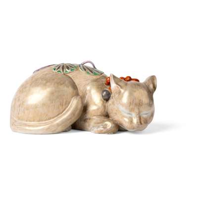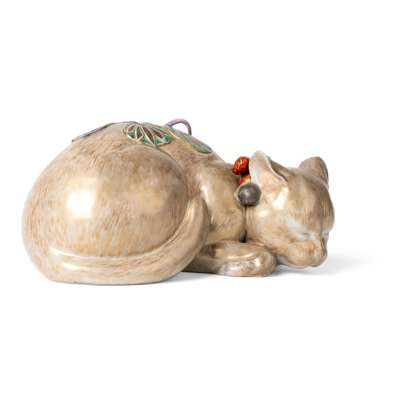 Compare to a Japanese Kaga ware porcelain sleeping cat, Taisho period, 20th century, sold at sotheby's London, 21 September 2021, lot 14.
