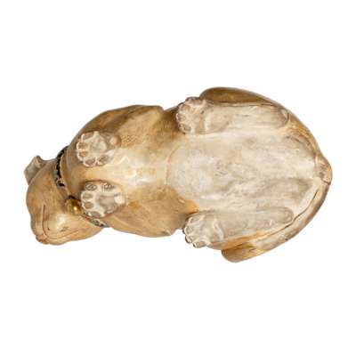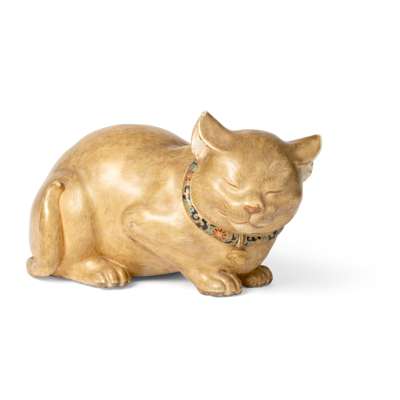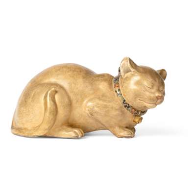 FINE AND RARE JAPANESE SATSUMA OKIMONO OF A LIFE-SIZE CROUCHING CAT