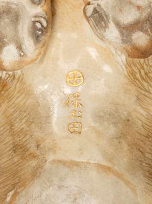 realistically moulded with eyes closed and head slightly turned to the right, wearing a bell collar decorated with kiku sprays and geometric designs on black ground, the base signed with a gilt Hododa mark below a Shimazu mon