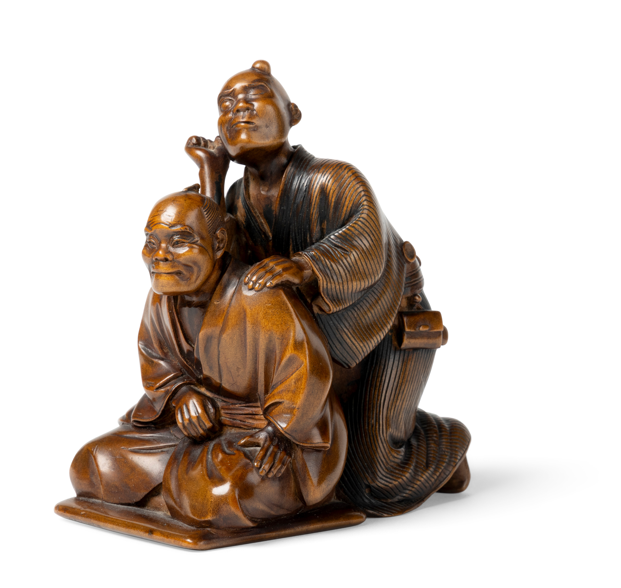 carved with a crossed-legged client seated in front of a kneeling masseur pressing his right elbow on the client's right shoulder, both faces minutely rendered, the base carved ‘Shoko saku’