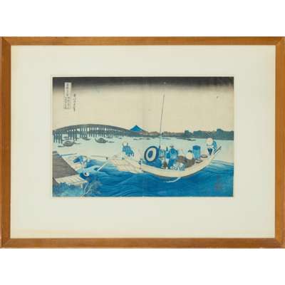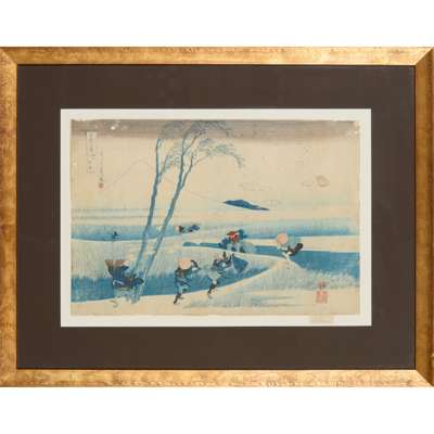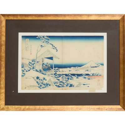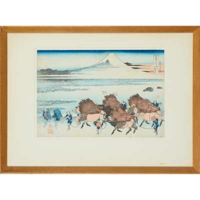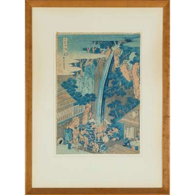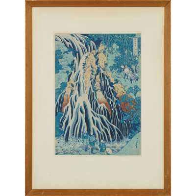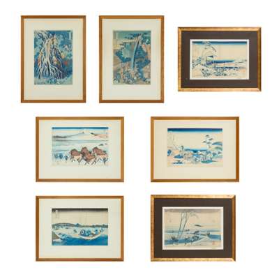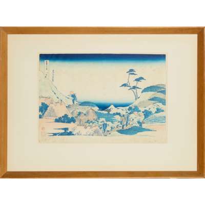 comprising: five oban yoko-e prints, titled ‘The Paddies of Ōno in Suruga Province’ (Sunshū Ōno-shinden); ‘Ejiri in Suruga Province' (Sunshū Ejiri), with collector's seal of Hayashi Tadamasa; ‘Lower Meguro’ (Shimo-Meguro); ‘Viewing Sunset over Ryōgoku Bridge from the Onmaya Embankment’ (Onmayagashi yori Ryōgoku-bashi no sekiyō o miru); ‘Snowy Morning at Koishikawa’ (Koishikawa yuki no ashita), with collector's seal of Hayashi Tadamasa, all from the series Thirty-six Views of Mount Fuji (Fugaku sanjūrokkei), Edo Period; and two later oban tate-e, titled ‘The Rôben Falls at Ôyama in Sagami Province (Sôshû Rôben no taki)’; and ‘Kirifuri Waterfall at Kurokami Mountain in Shimotsuke (Shimotsuke Kurokamiyama Kirifuri no taki), from the series A Tour of Waterfalls in Various Provinces (Shokoku taki meguri)’, all framed (7)