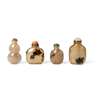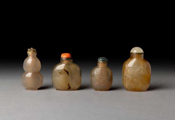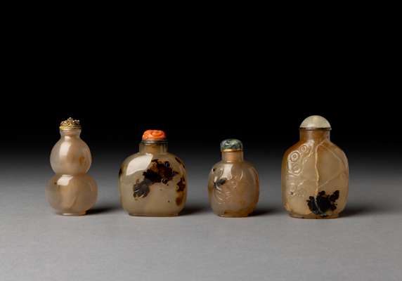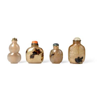 comprising: one gourd-shaped snuff bottle of plain form; one silhouette agate ‘goldfish’ snuff bottle; one smaller oblong agate snuff bottle carved with trees; and one larger oblong snuff bottle carved with flowers; all with stopper (4)