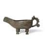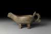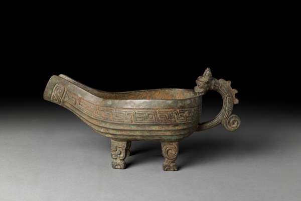after Western Zhou origins, finely cast as deep boat-shaped vessel raised on four stylised feet and with a curved U-shaped spout, cast around the body with three horizontal curving groove patterns under a wide band of abstract dragon motifs similar to key-fret motif below the rim, attached with a loop handle formed by a horned chi-dragon biting the edge, the interior of the base cast with two-character inscription in archaistic style