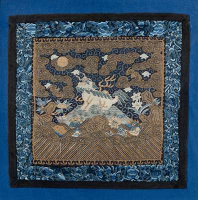Although the rank of most civil officials was identified with birds, those tasked with rooting out corruption wore badges decorated with the mythical xiezhi, a one-horned, lie-detecting beast. Squares like this one were donned by censors, judges, magistrates, and, eventually, anyone remotely related to the legal system.