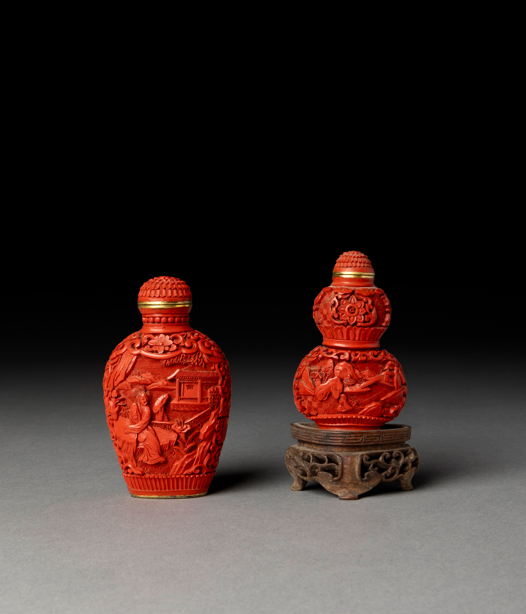 清 乾隆款(其一) 剔紅人物鼻煙壺(共兩件)帶一木座