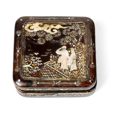 明末清初 黑漆嵌鏍鈿人物紋方形小蓋盒 共箱