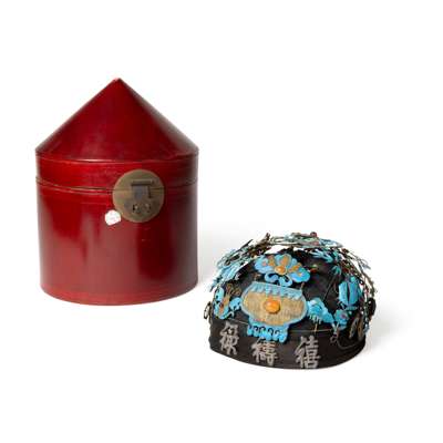 elaborately decorated and inset with seed pearls and other semiprecious stones depicting a flower basket on the front, further with butterflies, flowers, and auspicious emblems, the front below the decorations with three characters ‘Xi Shou Lu’ (happiness, longevity, prosperity), with a red-lacquer box