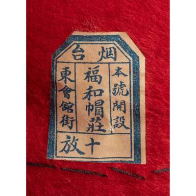 Inside of the hat with a rectangular paper label attached, reading ‘Yen Tai/ Ben Hao Kai She/ Fu He Mao Zhuang/ Dong Hui Guan Jie/ Shi Fang', showing this hat was either made or traded via the Fuhe Milliner located at Yantai city, Shandong province.