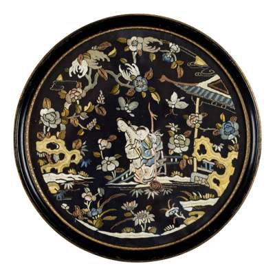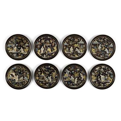 清 墨地刺繡庭院人物紋圓屏 鏡框(共八幅)