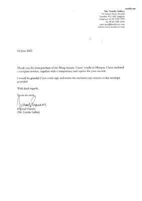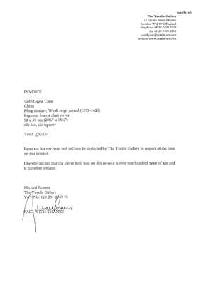 英格蘭私人收藏;2002年6月10日於Olympia古董博覽會購自當時位於倫敦梅費爾之「The Textile Gallery」畫廊主人麥可‧法蘭西斯(Michael Frances),附收據原件;另附該畫廊所出具之信函及研究。