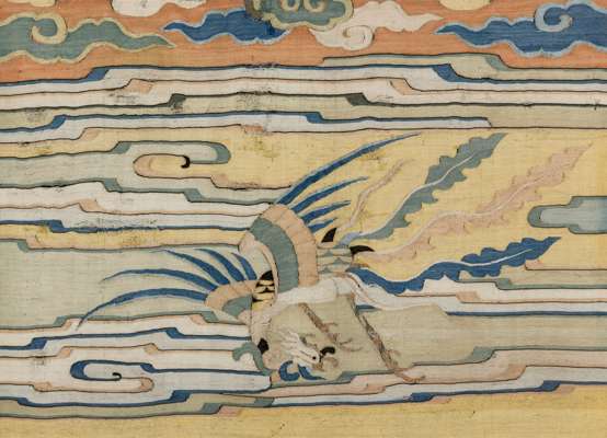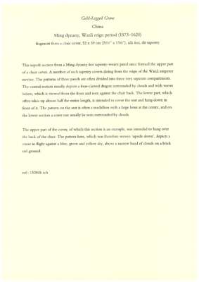 According to the research note from The Textile Gallery: “This superb section from a kesi tapestry-weave panel once formed the upper part of a chair cover…was intended to hang over the back of the chair.”