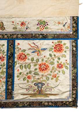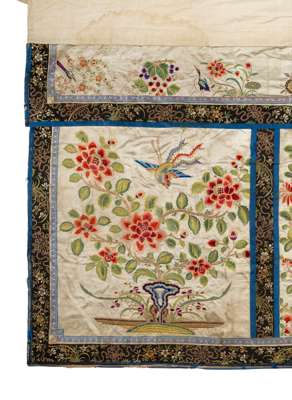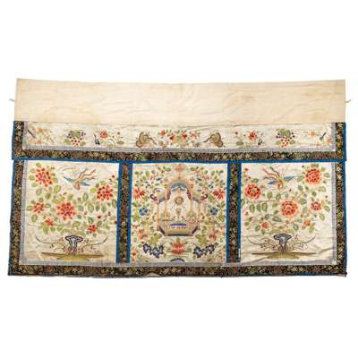 Compare to two related Chinese silk embroidered hangings, Guangzhou (Canton), for the Western export market, Qing Dynasty, early 19th century, sold at Sotheby's London, 23 May 2023, lot 29. One of the former was possibly from the same set as a panel in the Victoria and Albert Museum, London, accession no. E.1-1980.