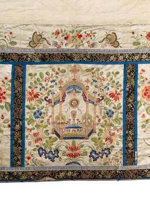 清 大型象牙白地刺繡花鳥庭院基督教符號橫幅