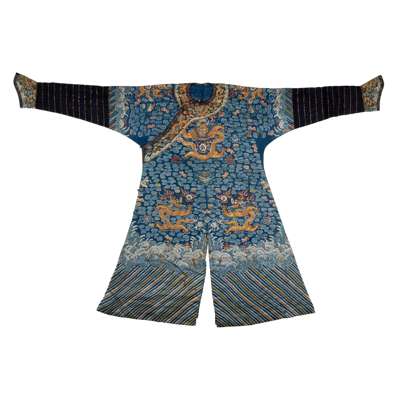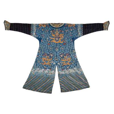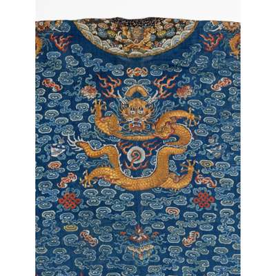 參一例清十九世紀初藍地納紗繡雲龍團花紋吉服,2020年9月30日售於紐約蘇富比,拍品1055,可資比較。