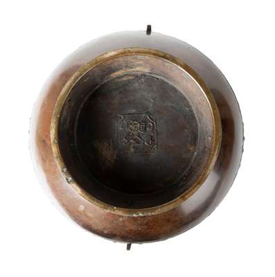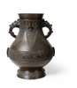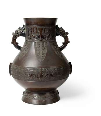 heavily cast with flaring neck and foot, the sides set with two stylised-dragon-head loop handles, the body finely cast with a broad band of taotie masks below descending formal cicada lappets with archaistic motifs on leiwen grounds, the neck with further large taotie masks while the foot with panels of confronting phoenix, the base with four archaistic-style characters within a square