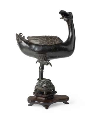 Bronze incense burner in the form of a goose or duck, either standing one-legged or two, is a relatively common subject matter. The three-legged toad, known as jinchan in Chinese, is a beloved mythical animal believed to beckon wealth, usually depicted with the immortal Liu Hai. However, it is unusual to see a duck standing on a toad. A comparable example, dated to the Ming dynasty, is in the Guanfu Museum, note the similarity of the composition of the duck and toad. According to the museum note, 'duck', in Chinese ya, is a homophonic pun for 'press' or 'insistence', and the toad symbolises wealth. The duck standing sideways on the toad implies a guaranteed unexpected, or sudden gain of wealth.
