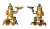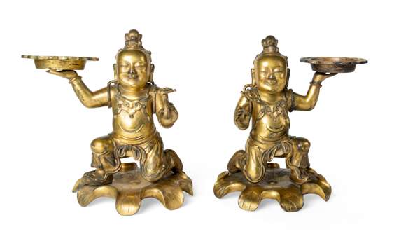 RARE PAIR OF CHINESE 'HEHE' TWIN BOYS GILT BRONZE CANDLE HOLDER ‡