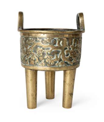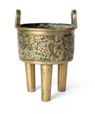 CHINESE BRONZE 'PRUNUS' DING-SHAPED TRIPOD CENSER