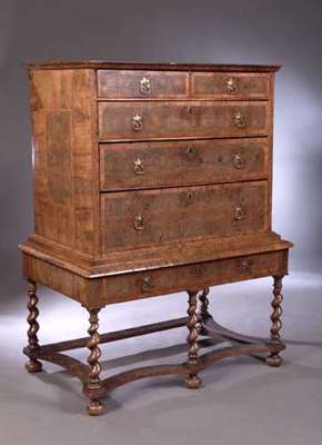 A William and Mary oyster veneered walnut chest on stand