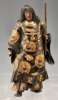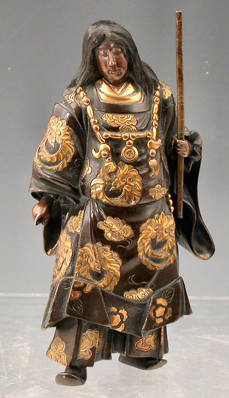 cast as a standing figure with long hair, wearing an ornate ceremonial robe with gilt mon decoration carrying a stick
