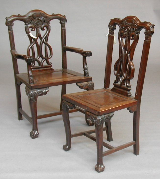 including two larger open armchairs with carved fist terminals to the arms, each with scrolling leaf carved top rail above interlaced pierced splat centred by anthemion, panelled board seat and carved cabriole front legs with ball and claw feet joined by H-stretcher (4)