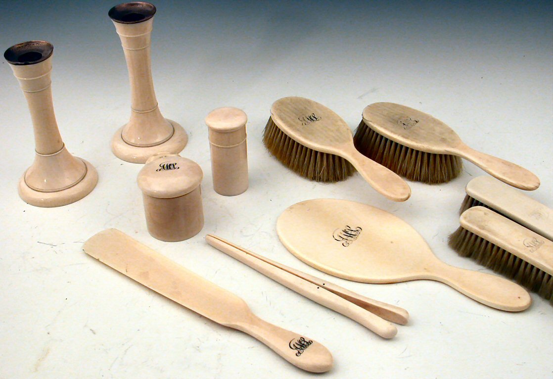 engraved with monogram 'AMcL', comprising a pair of long brushes, a pair of handled brushes, a pair of turned candlesticks, a hand mirror, pair of tweezers, shoe horn, powder jar in the form of an apple and two further turned jars (12)