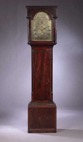 the twin train movement with anchor escapement striking on a bell, the arched brass dial with Roman chapters engraved with a joiner and scrolling foliage, and 'Jno Carmichael, Greenock', subsidiary seconds dial and date aperture, the hood with straight dentilled cornice and fluted columns, trunk with shaped door and quarter fluted columns, on panelled base