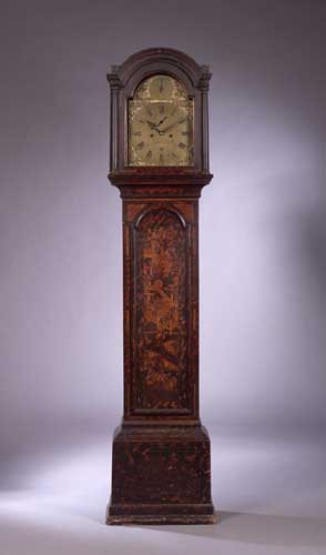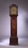 the twin train movement with anchor escapement striking on a bell, the arched brass dial with cast spandrels and strike/silent dial, subsidiary seconds dial and date aperture, the moulded arched hood with engaged columns above trunk with arched door decorated with figures, on plinth base