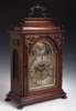 the four pillar movement into twin train fusee movement striking the quarters on two steel bells, the back plate engraved with Rococo scrollwork, the dial with silvered chapter ring and Roman Chapters enclosing dummy bob pendulum aperture and date aperture, the arch with strike/silent and fast/slow dials, the case with cast finials and leaf-cast handle above door with gilded gesso decoration and moulded base with cast paw feet
