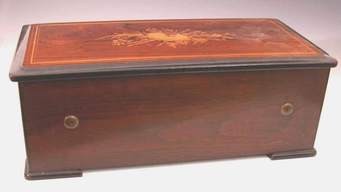 the movement with brass cylinder and steel comb, and with six accompanying graduated bells, contained within a stained pine case, the hinged lid veneered in rosewood and inlaid with a marquetry panel of musical trophies