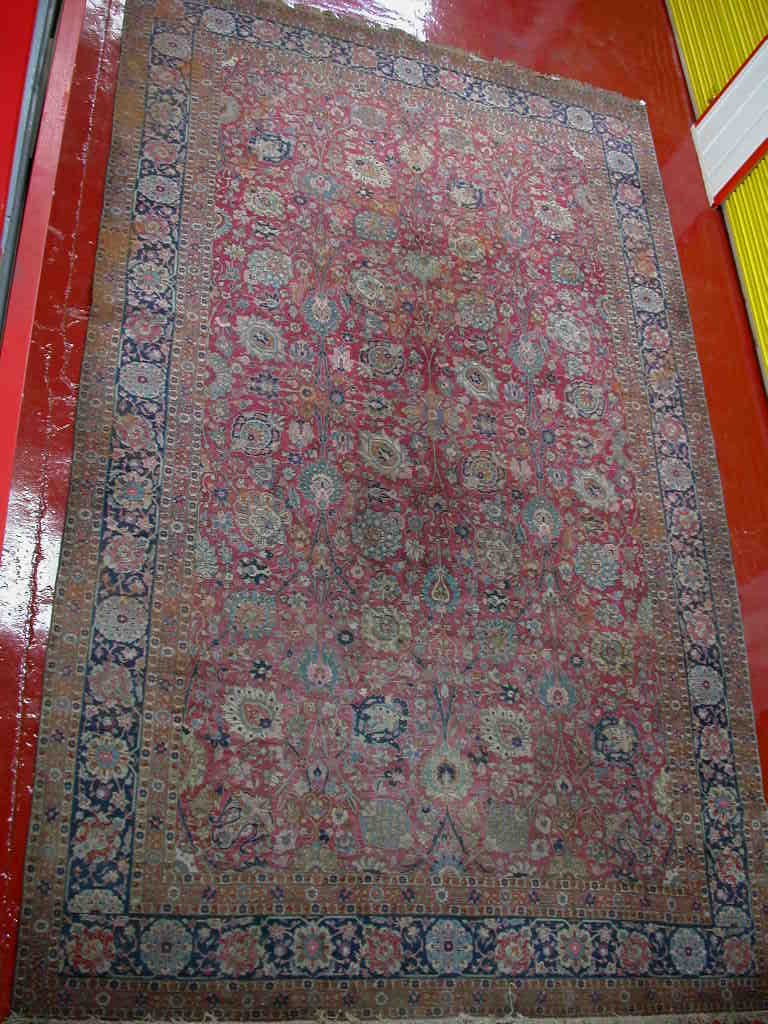 the claret field with allover pattern of scrolling vine and palmettes, within indigo scrolling vine, palmette and rosette border between rose and ivory bands