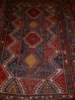 the narrow blue field with four hooked polychrome medallions, within wide polychrome hooked border with outer triangle and skittle bands