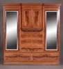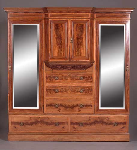 comprising a wardrobe, the reverse breakfront moulded cornice above centre section with inlaid panel door and open shelf below, above four graduated drawers, flanked by two panelled doors raised on a plinth, 207cm wide, 216cm high, 58cm deep; also a dressing table, the oval bevelled plate supported by a superstructure with three jewellery drawers, the semi-bowed top above central drawer flanked by twin pedestals of three graduated drawers on square tapering legs, 130cm wide; two pairs of single bed ends, each with ribbon swag inlay, 96cm wide