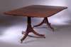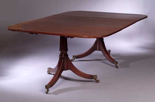 the rectangular top with rounded angles raised on turned pedestals with three sabre legs, brass caps and castors, with one extra leaf