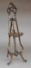 profusely C-scroll and leaf carved, of typical spreading form with moulded pilaster style uprights and adjustable picture rest