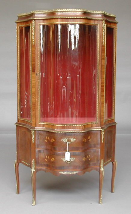 with gilt brass mounts, the shaped top with pierced gallery above serpentine glazed door flanked by concave glazed sides enclosing velvet lined interior on base with two corresponding floral inlaid drawers and cabriole legs