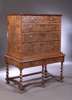 the crossbanded rectangular top inlaid with geometric boxwood pattern corresponding to the veneering, above ogee moulding and two short over three long graduated drawers, also crossbanded, ogee moulded plinth, on stand with single drawer and five barley twist legs joined by shaped stretcher with bun feet (legs and feet probably later)