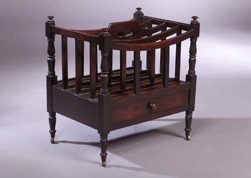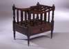 the four open slatted compartments with downswept top rails and turned and blocked corners, above single drawer and turned tapering legs with brass caps and castors