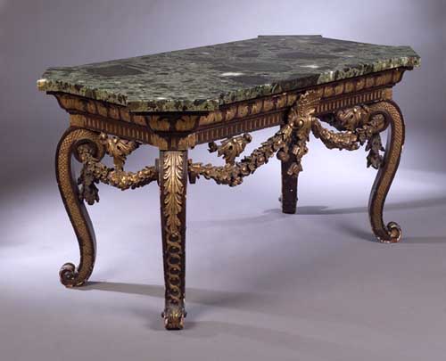 in the manner of William Kent, the rectangular verde antico marble top with lugged canted angles raised on stained and gilt wood and gesso base, the ogee acanthus carved and fluted frieze centred by shells to the long sides with oak leaf and acorn swags and drops, on canted acanthus, guilloche and fish scale carved console supports