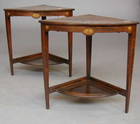 each with boxwood stringing, the bowed top with marquetry wreath above fan medallion inlaid frieze on square section tapered legs joined by undershelf (2)