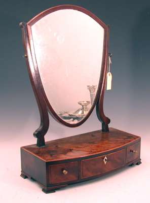 the shield shaped frame with curved supports on a bowfront base with three drawers, raised on ogee bracket feet