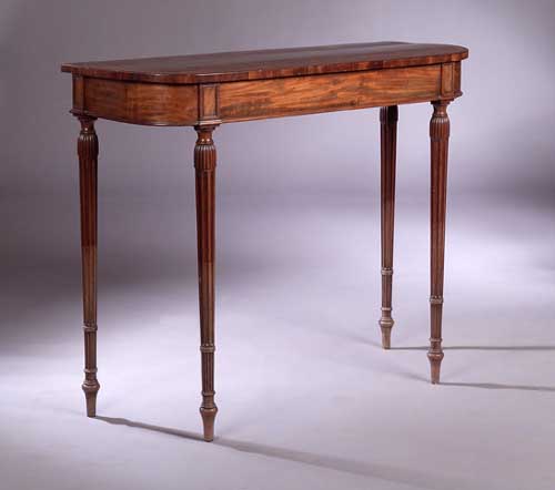 the D-shaped top with satinwood and tulipwood crossbanding and boxwood and ebony stringing above a plain frieze with panelled terminals to the reeded and fluted turned tapering legs