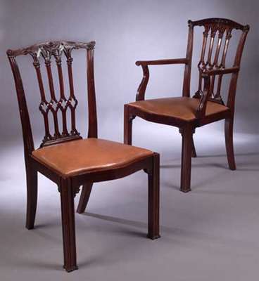of late 18th century style, including two carvers, each with curved leaf-carved top rails above chamfered spandrels with quatrefoil piercings, the drop-in seats on square moulded legs with stop feet and leaf carved brackets (8)