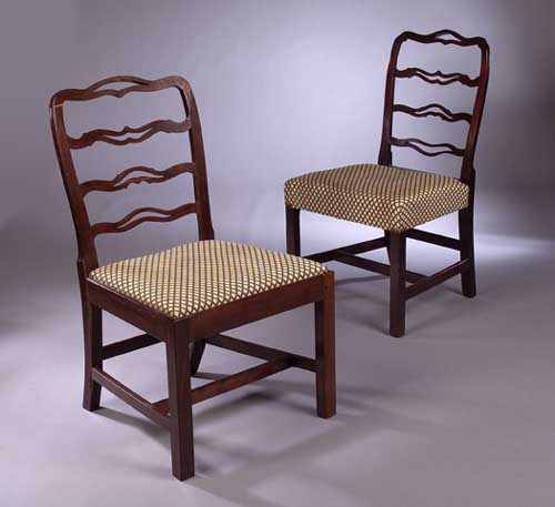 each with pierced serpentine ladder back, stuffover horsehair style wool seat and chamfered square section legs joined by H-stretcher
