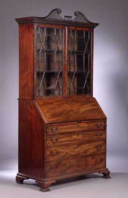 the swan neck pediment with pierced lattice fretwork, above two astragal glazed doors enclosing adjustable shelves, the sloping fall enclosing interior fitted with drawers and pigeonholes above four graduated drawers on ogee bracket feet
