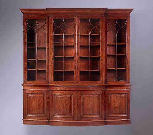 the moulded dentil cornice and plain frieze above four astragal glazed doors enclosing adjustable shelves raised on deeper serpentine base with panelled cupboard doors enclosing shelves and drawers on plinth base