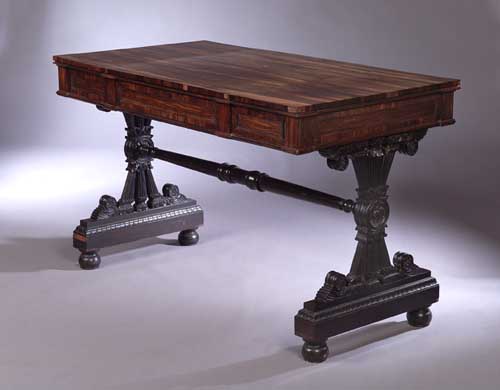with rosewood crossbanding, the rectangular top above three panelled frieze drawers opposed by reciprocal panels raised above reeded columnar supports with acanthus carved terminals centred by a foliate roundel linked by a turned stretcher and raised on leaf carved bases with turned feet