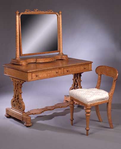 the rectangular top above pair of frieze drawers on pierced interlacing trestle supports with sled bases joined by pierced stretcher with two platforms, and turned feet