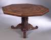 the octagonal tilt top with burr panel and elaborate marquetry and specimen wood decoration, on triangular pedestal with carved and turned columns and strapwork decoration on corresponding tripod base with moulded cabriole legs and scroll toes with castors